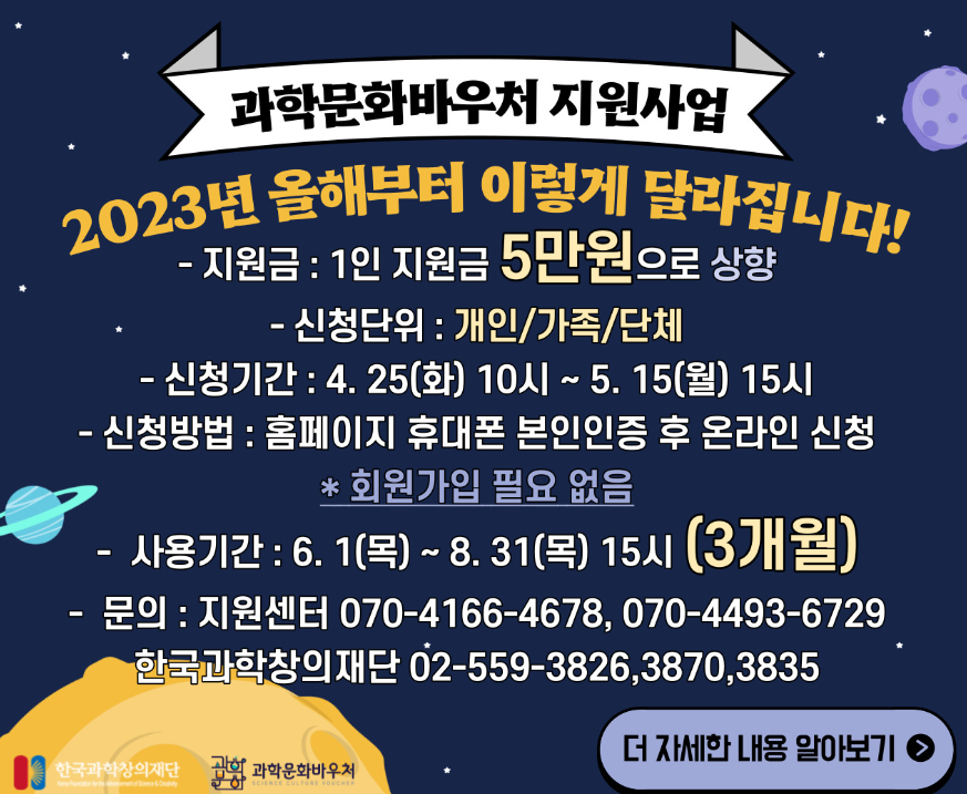 2023 과학문화바우처 신청이 시작되었습니다. 과학문화 격차해소를 위한 과학문화 상품 및 서비스 이용에 사용이 가능한 바우처를 소개합니다. 회원가입이 필요없고 인원제한이 있으니 빨리 신청하시기 바랍니다.